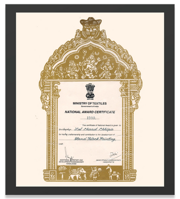Lalchand Chhipa Derawala is a National award-winning artisan who has been actively working to uplift the roots of Bagru art through his deliberate efforts. For the past Generation to generation , he has been offering his services to society by upskilling, hand block print bagru print Textiles